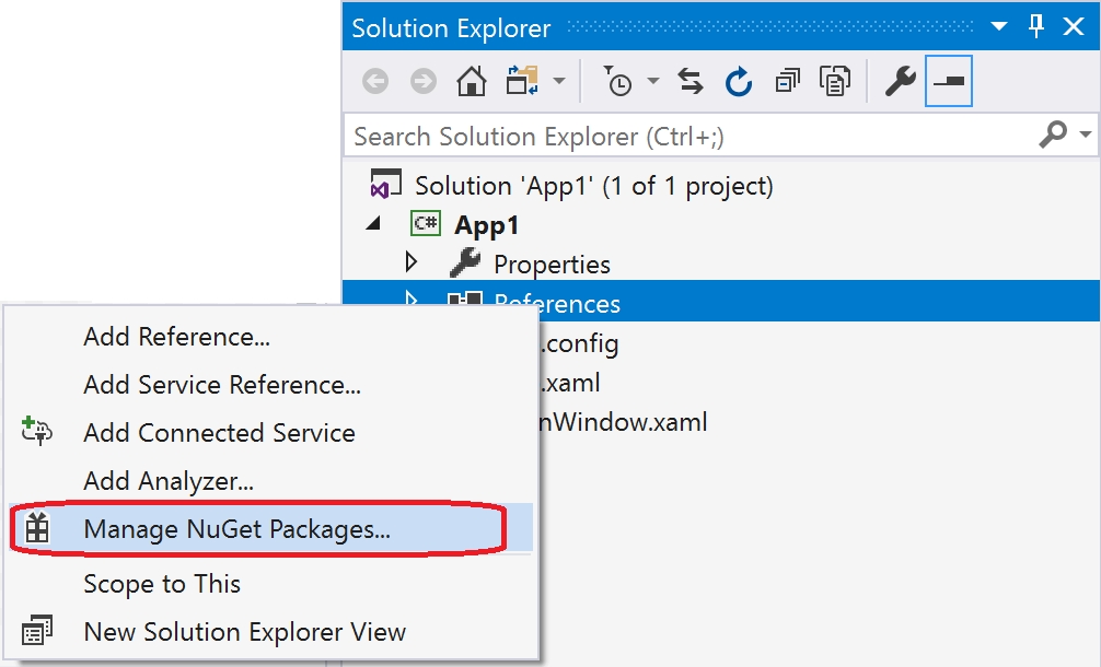 - В обозревателе решений щелкните правой кнопкой мыши узел Ссылки и выберите пункт Управление пакетами NuGet.